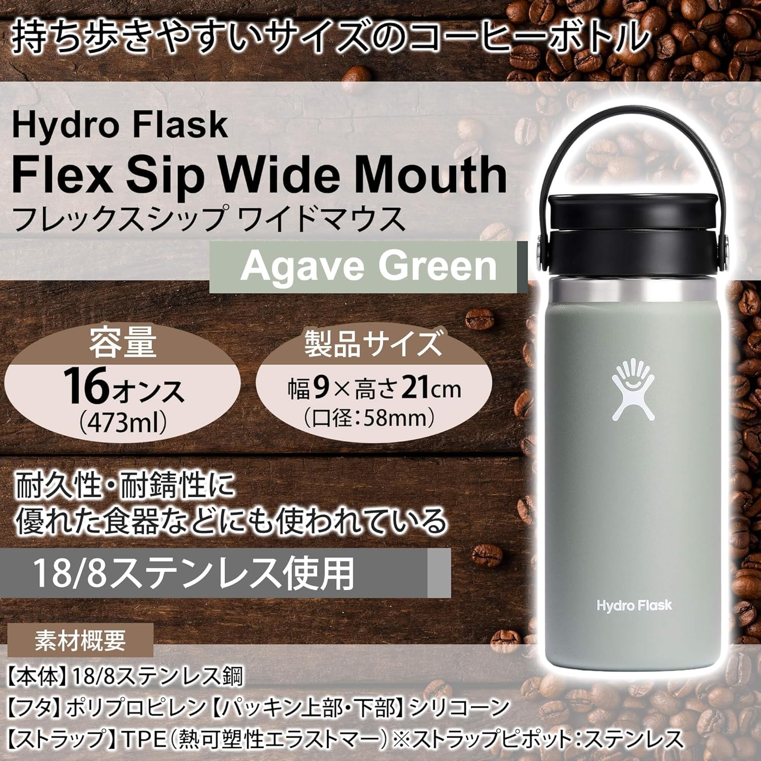 Brand: Hydro Flask , Capacity: 473 Milliliters , Color: Agave , Recommended Uses For Product: Cooking, Travel, Camping, Hiking, Sports , Special Feature: Wide mouth , Age Range (Description): Adult , Product Dimensions: 2.28″W x 7.87″H , Model Name: COFFEE 16oz FLEX SIP WIDE MOUTH , Item Weight: 0.34 Kilograms , Material: Stainless Steel , Number of Items: 1 , Included Components: No , Product Care Instructions: Dishwasher Safe , Cap Type: Flex Cap , Manufacturer: HYDRO FLASK , Item Weight: 11.8 ounces , ASIN: B0CHVTR5NV , Item model number: 5000000062089 , Customer Reviews: 4.14.1 out of 5 stars(18)4.1 out of 5 stars , Best Sellers Rank: #2,178,778 in Kitchen & Dining (See Top 100 in Kitchen & Dining)#2,520 in Camping & Hiking Hydration Canteens#15,438 in Insulated Bottles , Date First Available: September 16, 2023 , Brand: Hydro Flask , Capacity: 473 Milliliters , Color: Agave , Recommended Uses For Product: Cooking, Travel, Camping, Hiking, Sports , Special Feature: Wide mouth