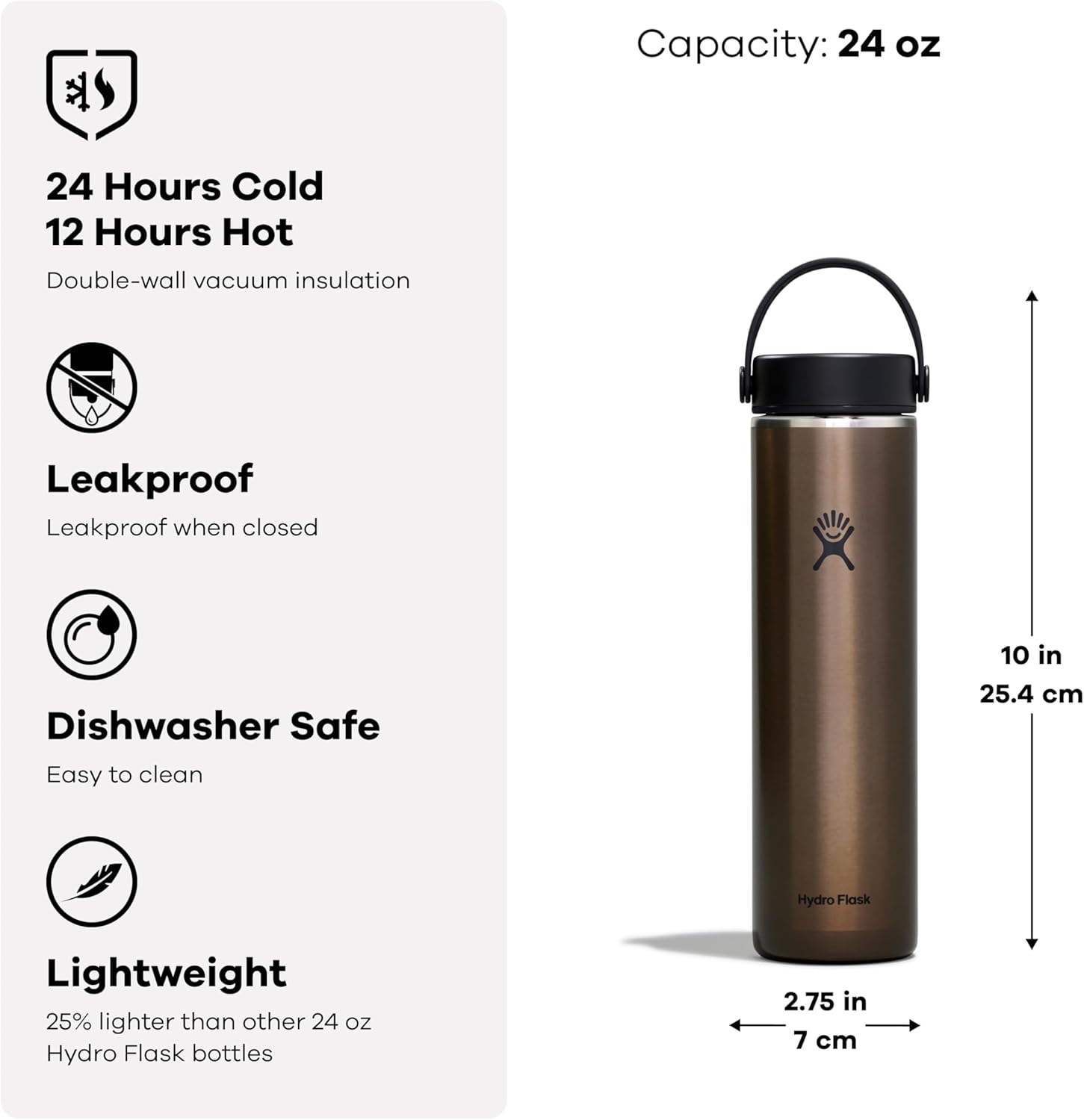 Brand Name: Hydro Flask , Recommended Uses For Product: Water , Age Range Description: Adult , Model Name: Lightweight Flex Bottle , Included Components: Bottle , UPC: 810096852212 , Manufacturer: Hydro Flask , Customer Reviews: 4.74.7 out of 5 stars(1,175)4.7 out of 5 stars , Best Sellers Rank: #6,318 in Sports & Outdoors (See Top 100 in Sports & Outdoors)#8 in Camping & Hiking Hydration Flasks , ASIN: B0CQKL881J , Item Type Name: Water Bottle , Item Height: 25.4 centimeters , Unit Count: 1.0 Count , Manufacturer Warranty Description: LIFETIME , Capacity: 710 Milliliters , Item Weight: 0.35 Kilograms , Number of Items: 1 , Additional Features: Double Wall , Cap Type: Flex Cap , With Lid: Yes , Material Type: Stainless Steel , Product Care Instructions: Hand Wash Only , Color: OBSIDIAN , Brand: Hydro Flask , Capacity: 710 Milliliters , Color: OBSIDIAN , Recommended Uses For Product: Water , Special Feature: Double Wall