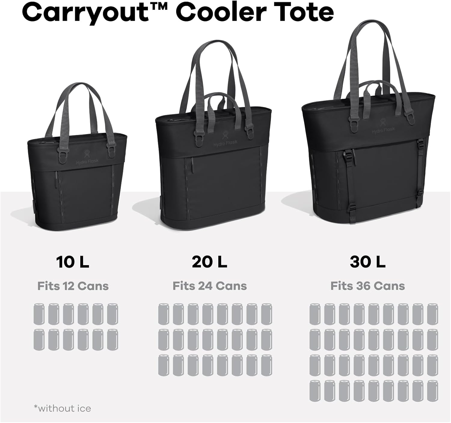 Introducing the Hydro Flask Carryout? Cooler Totes, a premium line of insulated totes designed for the modern on-the-go lifestyle. Tailored for comfort and practicality, these insulated cooler totes offer an unmatched combination of style, functionality and performance. Crafted for durability and convenience, the Carryout? Cooler Totes feature a 100% recycled polyester main body fabric with a robust coating, ensuring long-lasting performance. The innovative FlexClip? Strap System offers strong, removable and customizable handles and straps, allowing you to tailor the carrying experience to your preference. The easy-to-clean, leakproof welded liner ensures all contents stay fresh. Experience all-day cold retention with our optimized insulation technology, especially when paired with an ice pack.