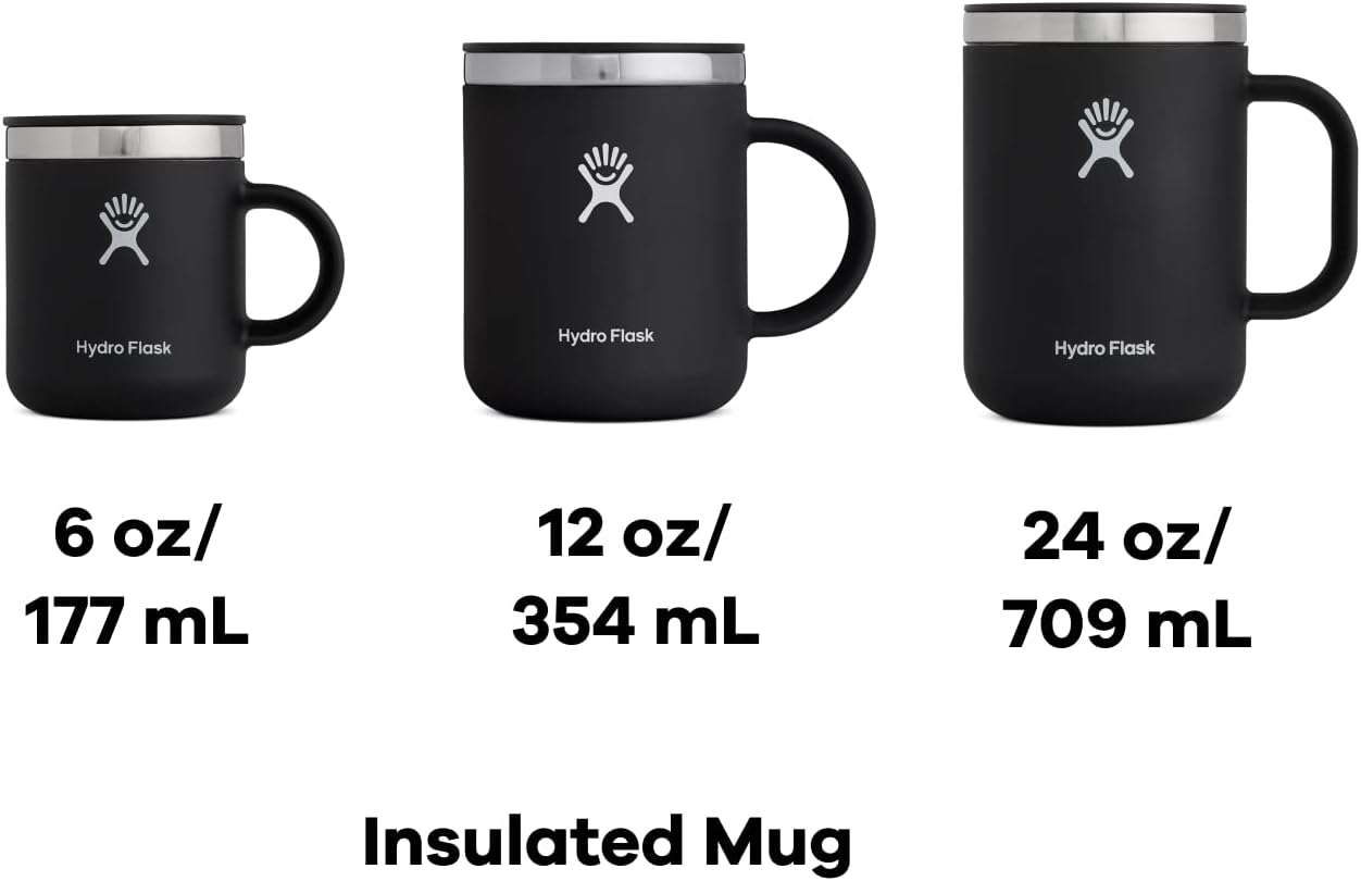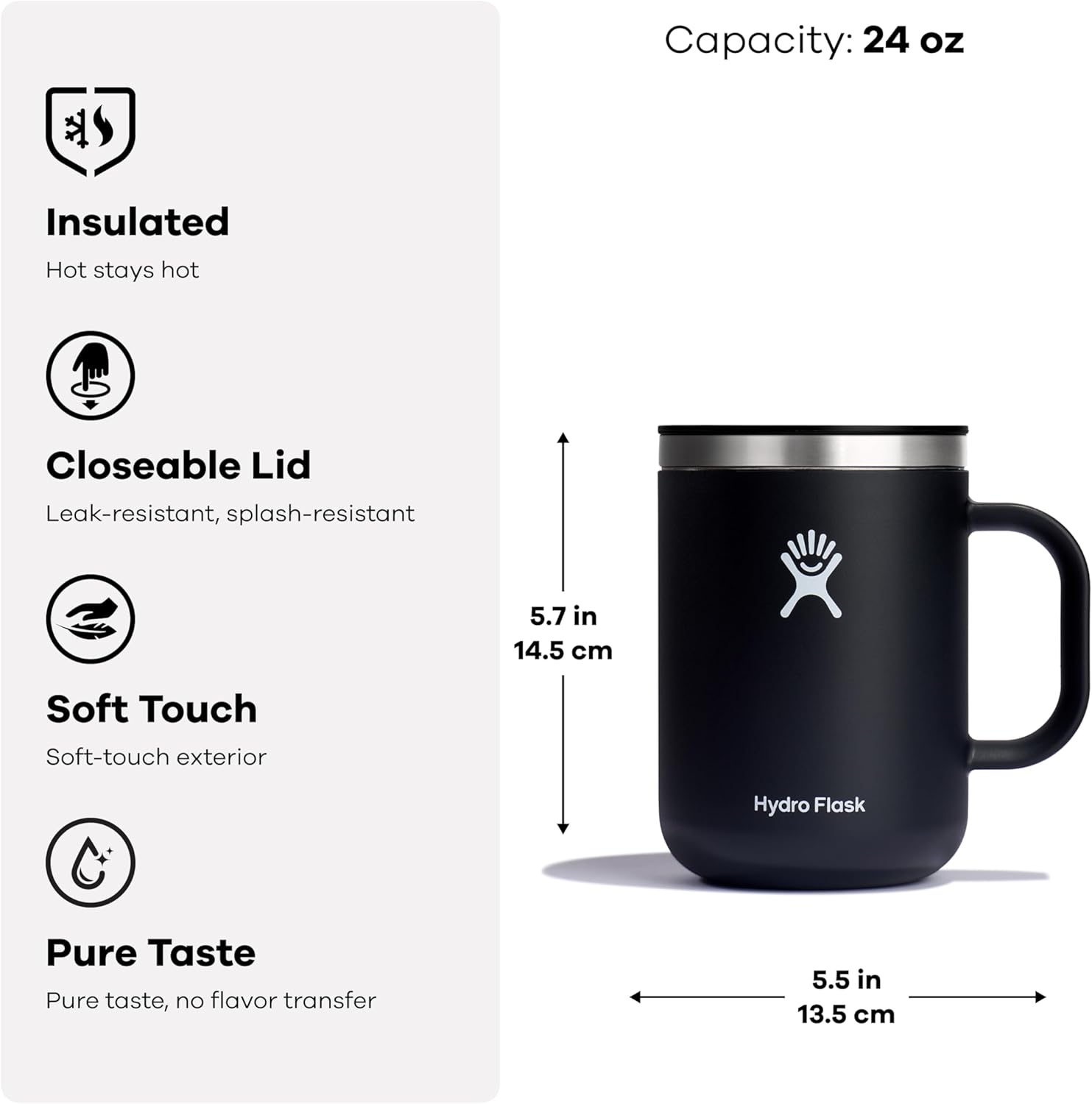 The Hydro Flask 24 Oz stainless steel insulated mug keeps drinks hot for hours. Sized for perfect pours with a closeable, splash-resistant lid.