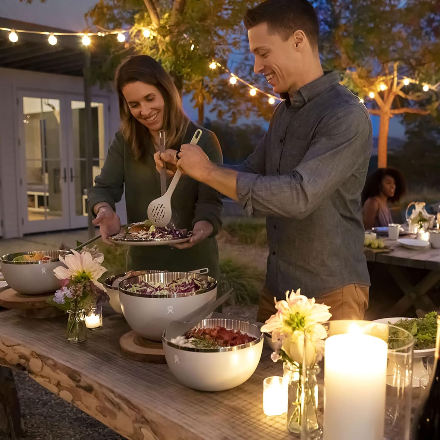 Big enough to serve meals at camp, the BBQ or on the dining table. Our 3 and 5 quart Serving Bowls with Press-in Lids keep food hot or cold till chow time, and hands stay comfy even when the contents are hot thanks to TouchShield? insulation.