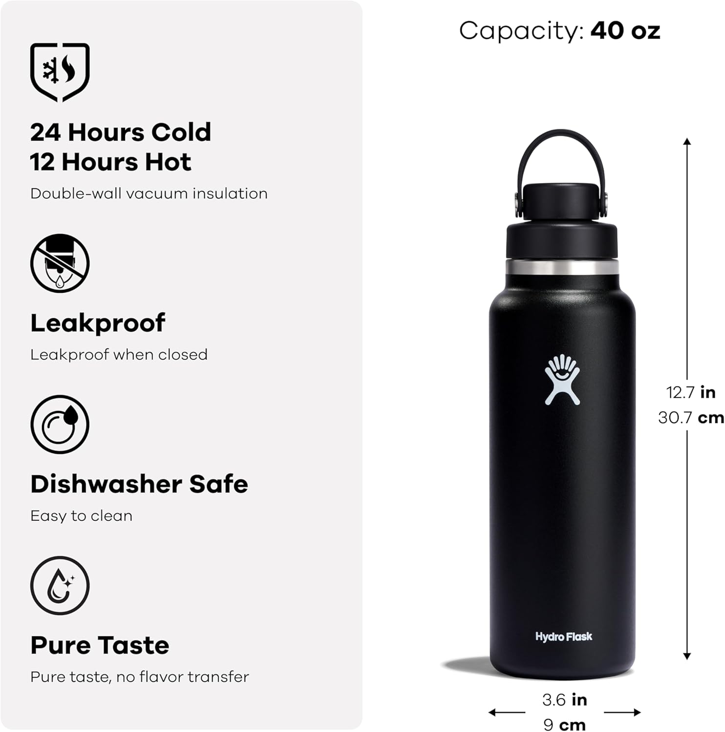 24 HOURS COLD The insulated bottle keeps drinks cold for 24 hours thanks to double-wall vacuum insulation. Hydro Flask water bottles feature TempShield insulation, designed to be lightweight and efficient temperature retention, keeping contents chilled all day. Flex Chug Cap not intended for use with hot drinks.